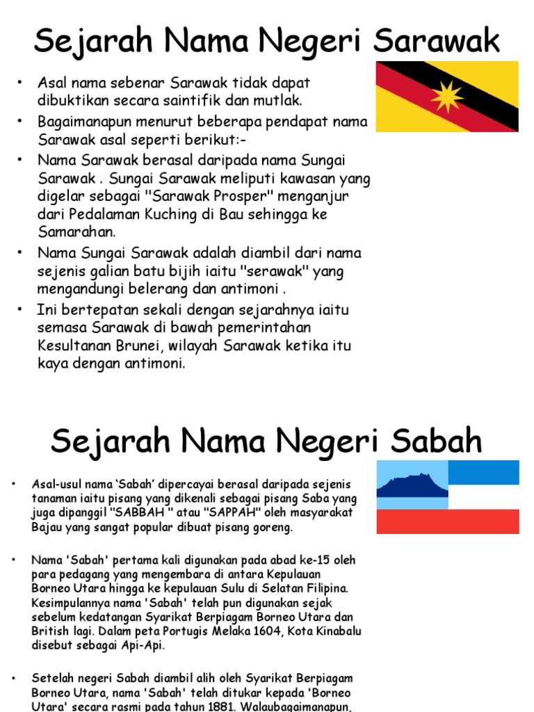 SEJARAH NEGERI SABAH. Sejarah asal-usul keturunan komuniti Melayu Sarawak begitu unik serta mempunyai identiti yang tersendiri. NEGERI SARAWAK Berasal daripada Nama panggilan nama Sungai Sarawak adalah Sarawak.